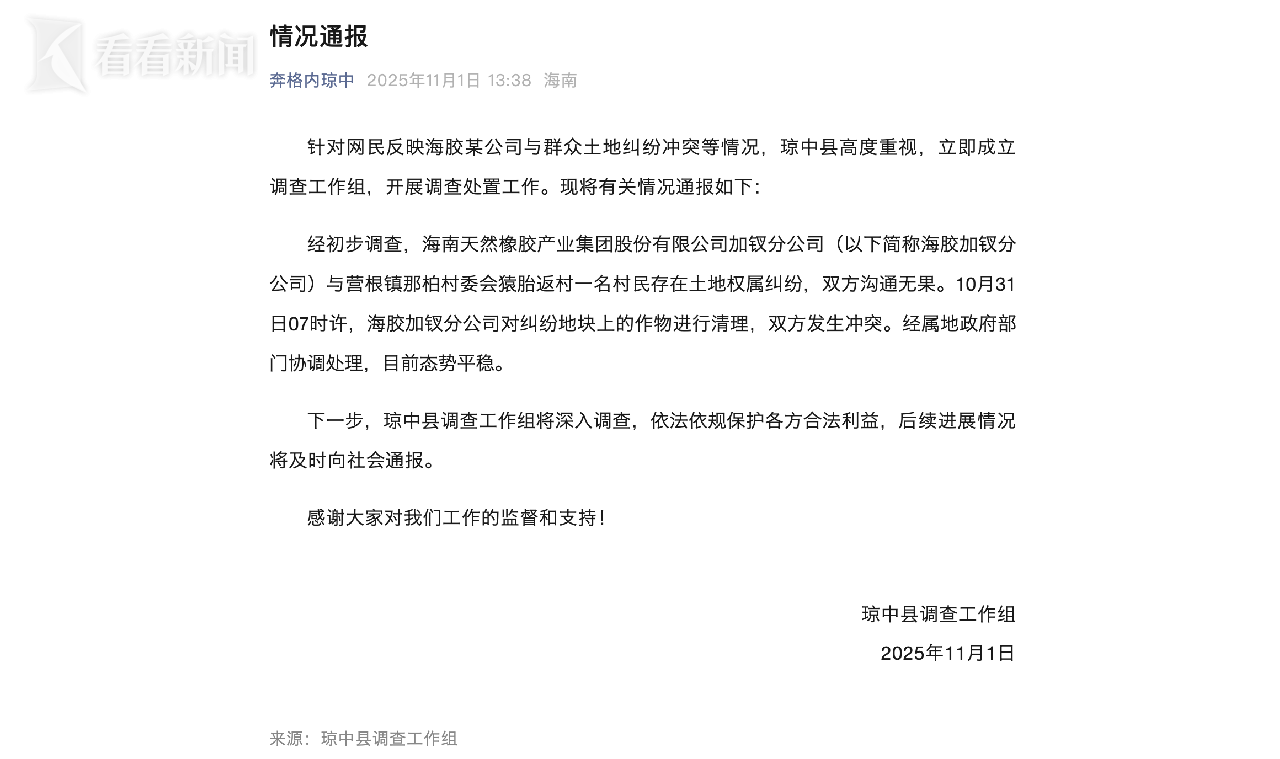 11月1日,海南省琼中黎族苗族自治县发布情况通报。针对网友举报的海胶公司与群众发生土地纠纷、矛盾等情况,琼中黎族苗族自治县高度重视,立即成立调查工作组,开展调查和工作解决。现将有关情况通报如下:经初步调查,海南天然橡胶产业集团有限公司加柴分公司(以下简称海胶加柴分公司)与营根镇纳白村委会源太汇村一村发生土地权属纠纷,双方沟通无果。 10月31日7点左右,海角加柴分公司在争议地块清理农作物时,双方发生冲突。经过当地政府部门协调处理,目前局势稳定。在t下一步,琼中黎族苗族自治县调查组将深入调查,依法依规保障各方合法权益。开发进展情况将及时向社会公布。编辑:王泽斌 编辑:丁涛 上一篇:第六届艺术设计创新未来教育博览会在上海开幕